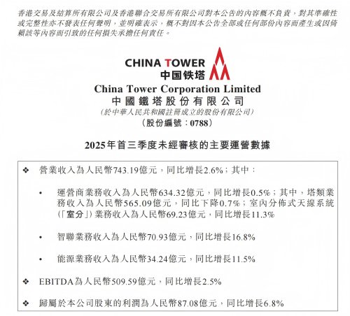 财报显示,中国铁塔2025年前三季度,营业收入实现743.19亿元,同比增长2.6% ;EBITDA实现509.59亿元,EBITDA率为68.6% ;归属于本公司股东的利润为87.08亿元,同比增长6.8% 。