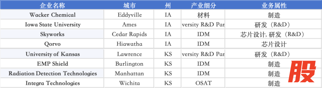 Iowa 与 Kansas 通过 Iowa State University、University of Kansas 等高校形成纳米器件与辐射检测等细分方向,EMP Shield、Integra Technologies 等公司则承担国防与特种电子制造;