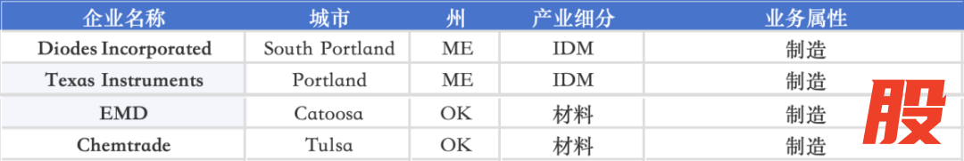 此外,缅因州(ME)由 Diodes Incorporated与 Texas Instruments承担模拟与特色制程供应链,俄克拉荷马州(OK)则由EMD与Chemtrade提供材料补链能力,进一步强化美国南部与内陆制造网络。