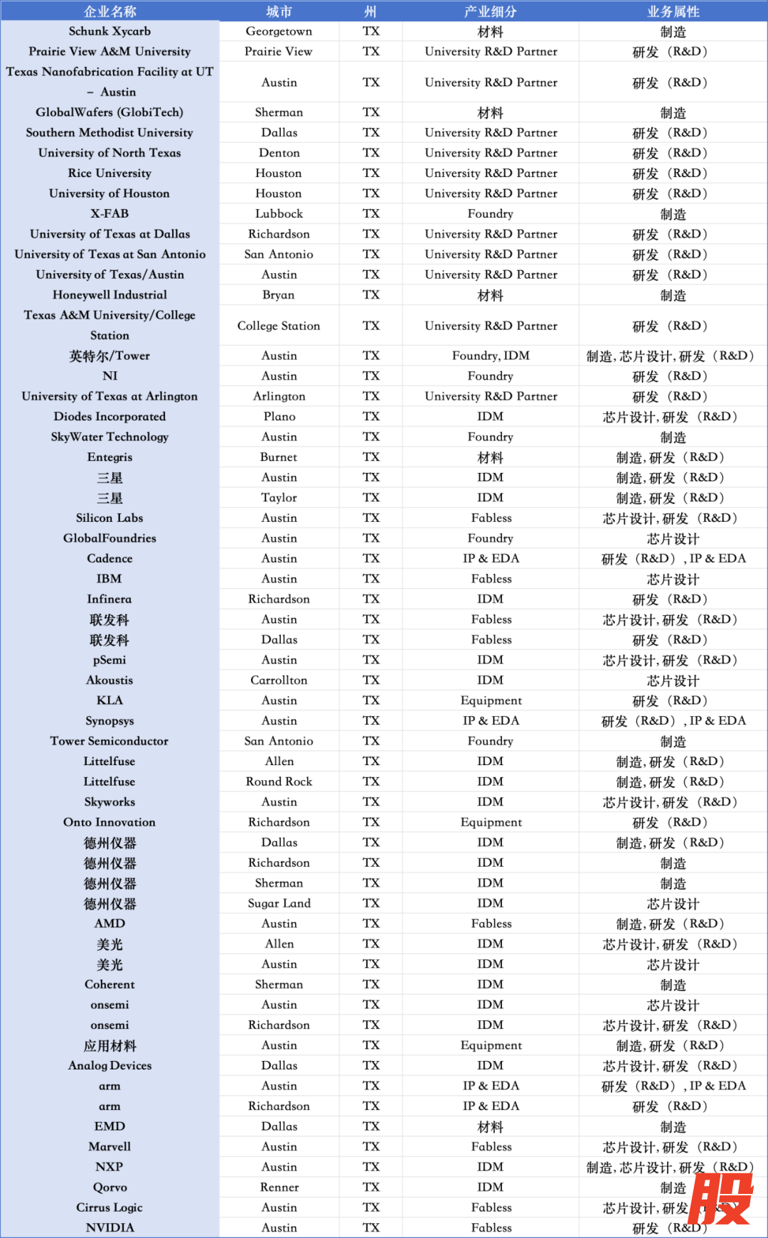 核心力量包括:德州仪器(达拉斯 + Sherman + Richardson)、三星(Austin + Taylor)、恩智浦(Austin)、GlobalWafers(Sherman)、Applied Materials(Austin)。