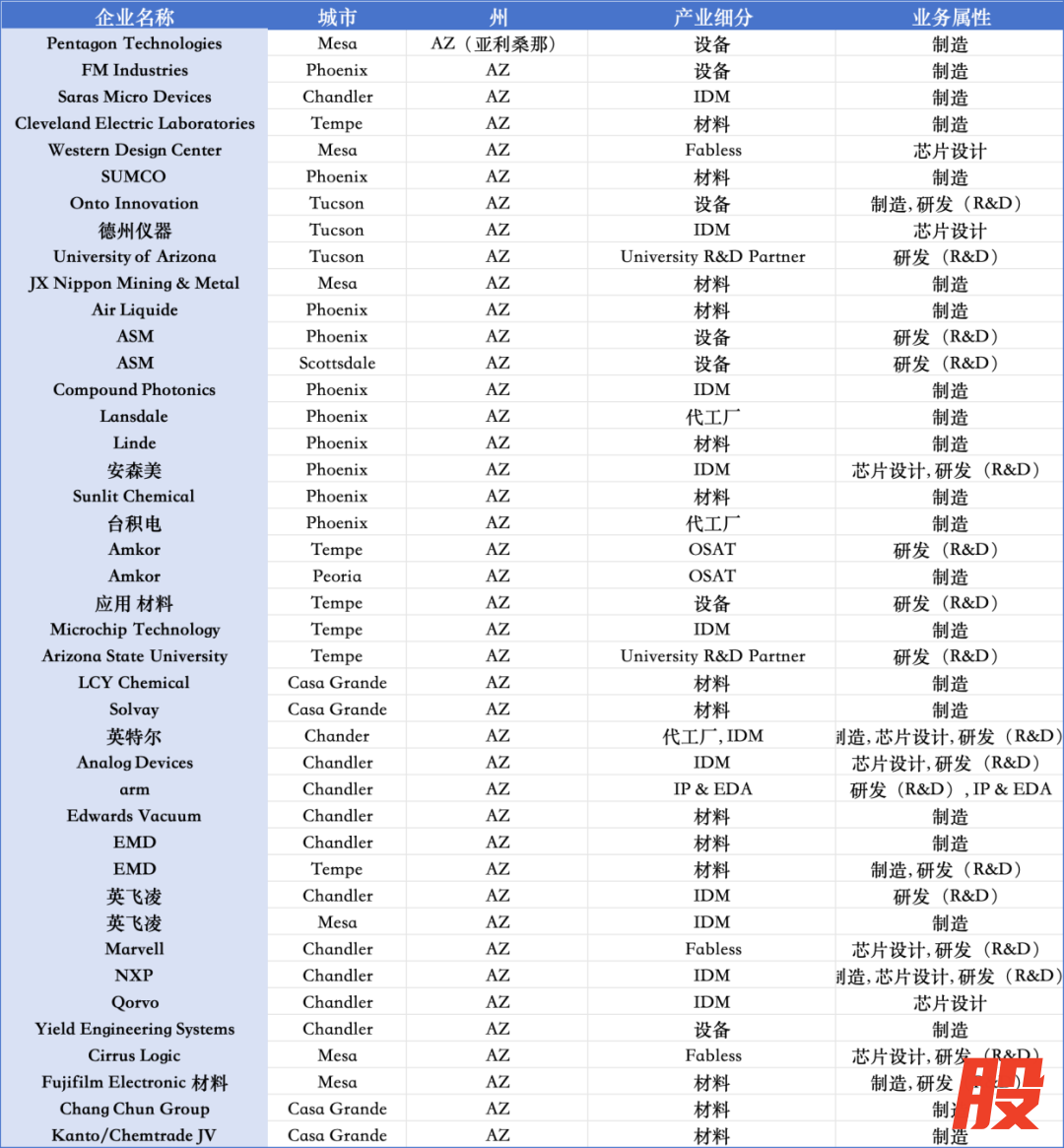 在亚利桑那州,台积电的凤凰城工厂是先进制程核心基地、英特尔的钱德勒工厂是美国本土最关键先进制程研发中心之一、Amkor位于皮奥里亚的工厂是美国最大OSAT基地、此外,还有NXP / onsemi / Analog Devices / 英飞凌 / Marvell / Qorvo / Cirrus Logic 等 IDM与Fabless全面布局。