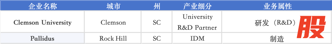 南卡罗来纳州(SC)围绕 Clemson University 与 Pallidus 布局材料、功率器件与大学科研,在车规功率与化合物半导体方向承担重要补链角色。