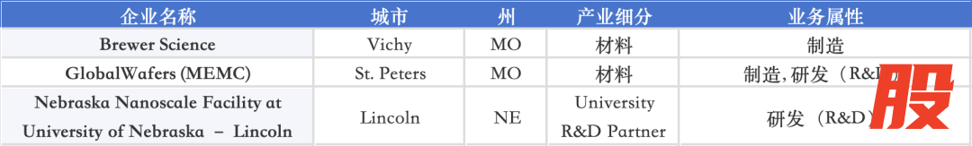 Missouri 与 Nebraska 侧重材料与大学科研,例如 GlobalWafers(MEMC)、Brewer Science 以及 University of Nebraska–Lincoln,为美国本土提供一部分硅材料与涂层技术供应。