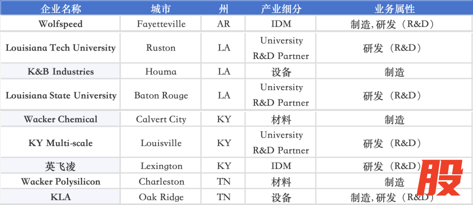 在美国南部内陆,Arkansas(阿肯色)、Louisiana(路易斯安那)、Kentucky(肯塔基)、Tennessee(田纳西)共同承担材料与设备补链:阿肯色由 Wolfspeed 承担化合物半导体 IDM,路易斯安那由 Louisiana Tech / LSU 和 K&B Industries构成科研与设备体系,肯塔基聚合 Wacker Chemical、KY Multi-scale 和 Infineon,田纳西则以 Wacker Polysilicon 与 KLA 完成材料与前道设备补位。