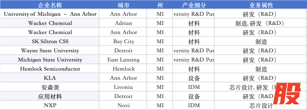在中西部,Illinois(伊利诺伊)、Indiana(印第安纳)、Ohio(俄亥俄)、Michigan(密歇根)、Iowa(爱荷华)、Kansas(堪萨斯)、Missouri(密苏里)与 Nebraska(内布拉斯加)共同构成了一个“材料 + IDM + 汽车电子 + 大学科研”的综合带: