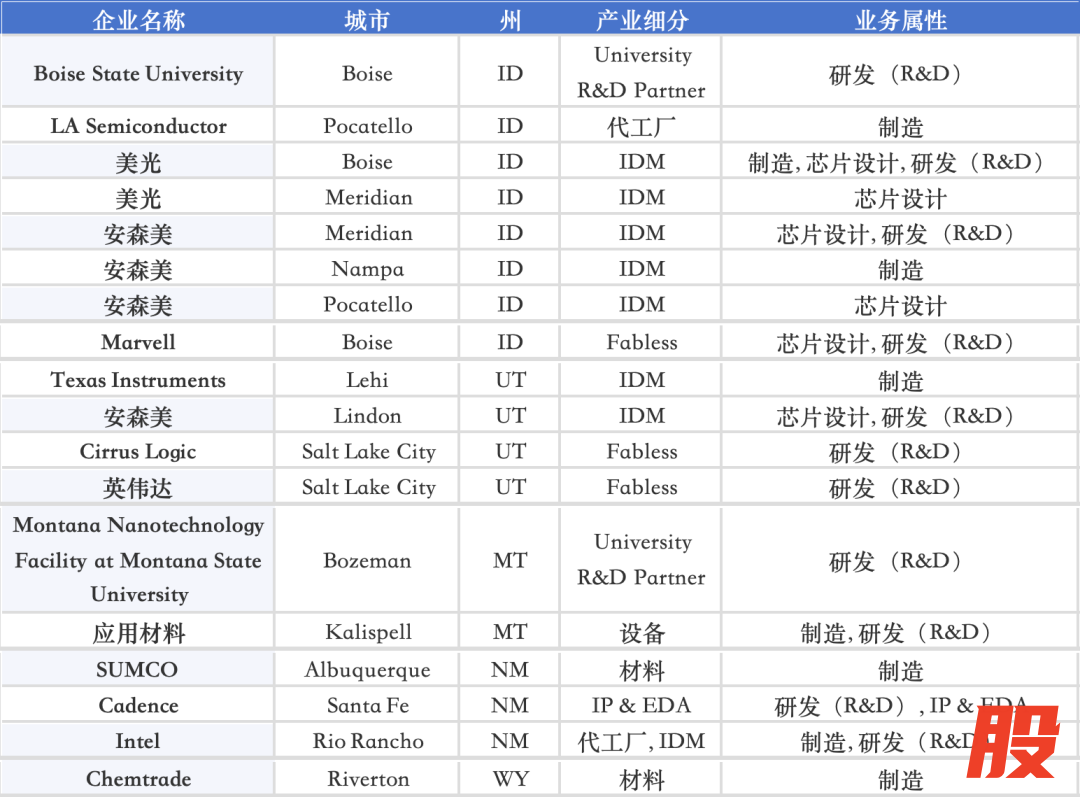 进一步向西、向北延伸到 Idaho(爱达荷)、Utah(犹他)、Montana(蒙大拿)、New Mexico(新墨西哥)等“山地州”,则形成了存储 + 设备 + 化合物半导体 + 高校研究的内陆技术带:Idaho 以 Micron Meridian 与 Boise State University 为代表,是存储与工艺研发的重要基地;Utah 聚集 BYU、Utah State University 与 Onto Innovation,在检测计量与设备端具备优势;Montana 依托 Montana State University 与 Applied Materials 的设备布局,承担部分前道工艺研发;New Mexico 则以 Intel Rio Rancho 的封装 / IDM 项目、Cadence 的研发中心以及 SUMCO / EMD 等材料企业,为美国西南方向提供制造与设计协同能力。Wyoming(怀俄明)由 Chemtrade 等材料企业承担化学品与工业材料供应,为内陆地区提供工艺材料补链能力。