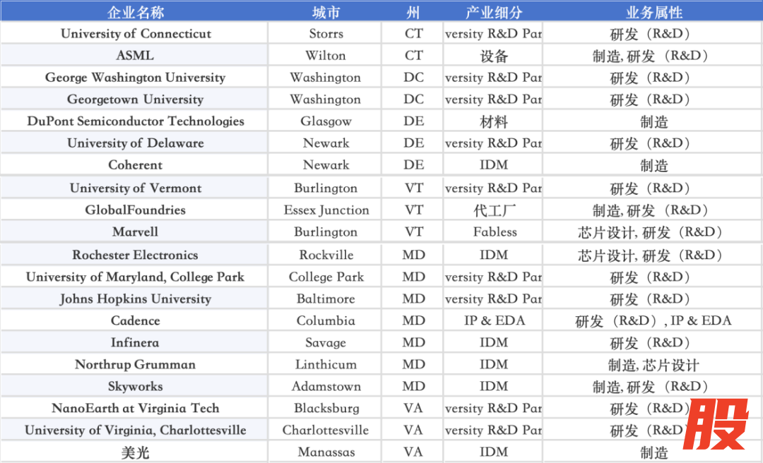 康涅狄格州(CT)、佛蒙特州(VT)、特拉华州(DE)、华盛顿哥伦比亚特区(DC)、马里兰州(MD)和弗吉尼亚州(VA)半导体生态布局情况